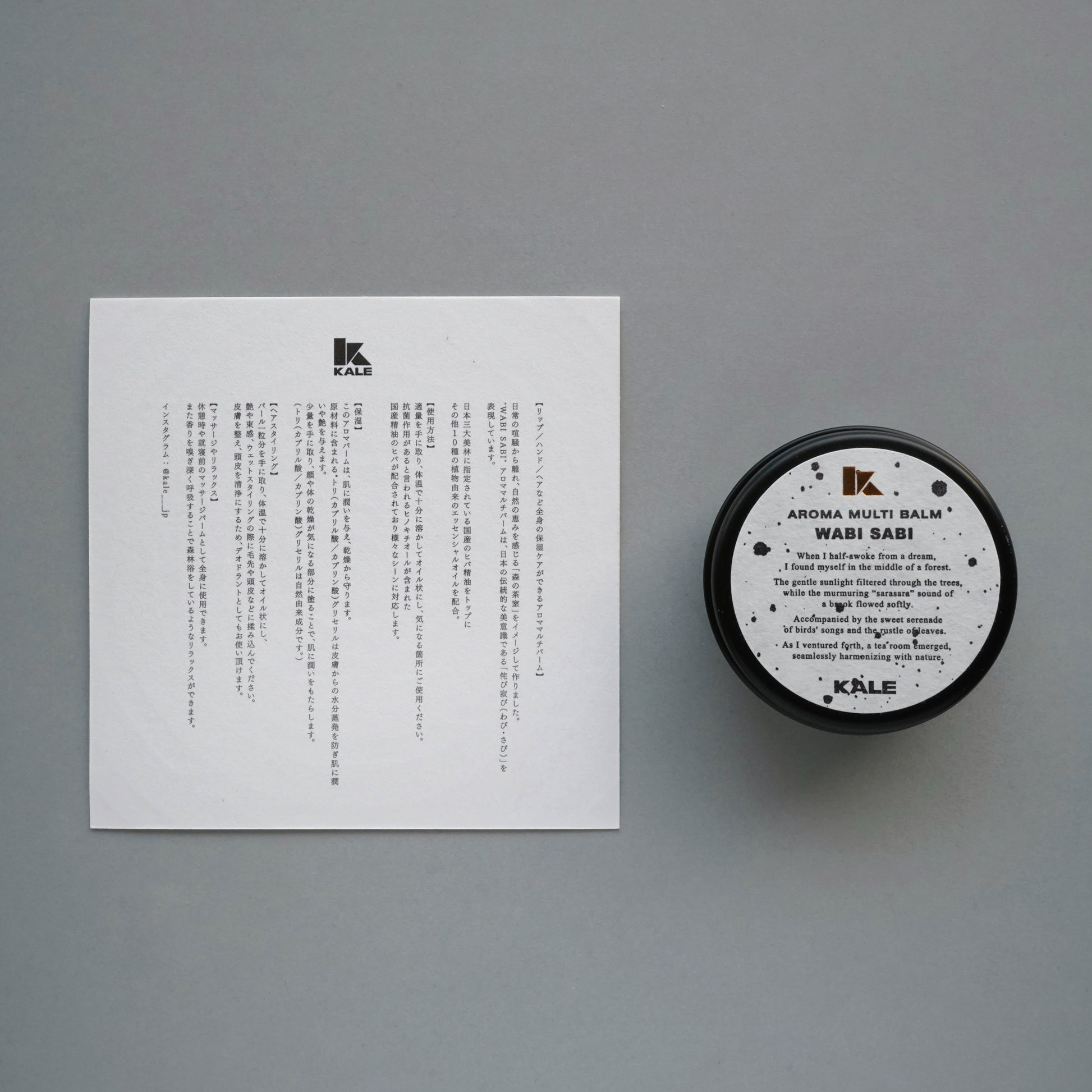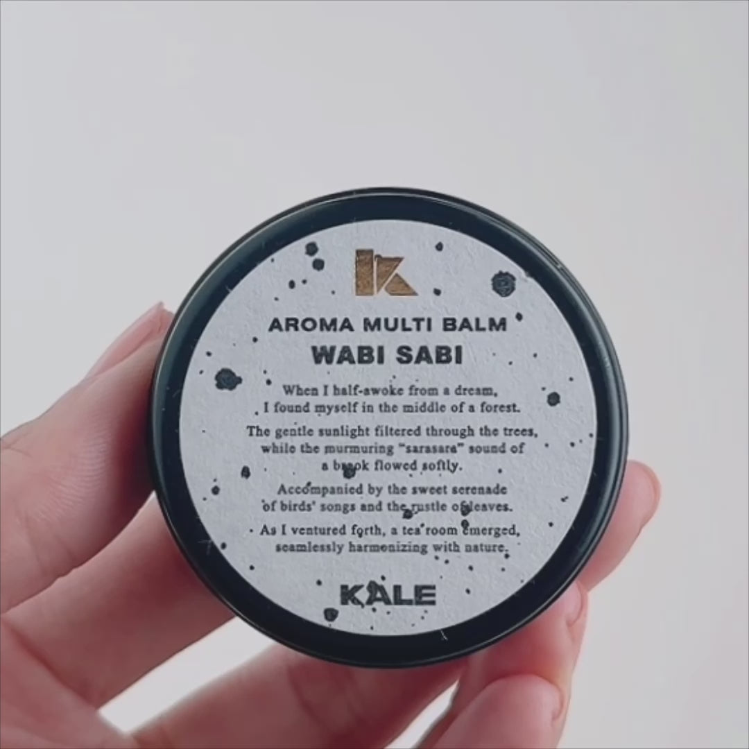日常の喧騒から離れ、自然の恵みを感じる「森の茶室」をイメージし調香されたアロママルチバーム"WABI SABI" は、日本の伝統的な美意識である「侘び寂び(わび・さび)」を表現し、身体と心を穏やかな調和へと導きます。
